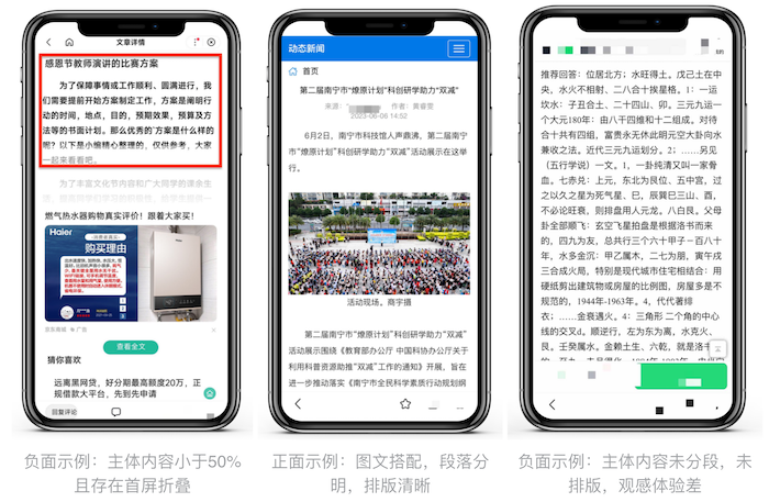 首屏主體內(nèi)容不能少于整體頁面的50%,并且主體內(nèi)容應(yīng)位于手機(jī)屏幕的中心位置。注意排版精良,段落分明。合理使用不同字號區(qū)分頁面的主次信息,注意調(diào)節(jié)圖片、視頻等多媒體資源的位置及尺寸,配合頁面整體布局。